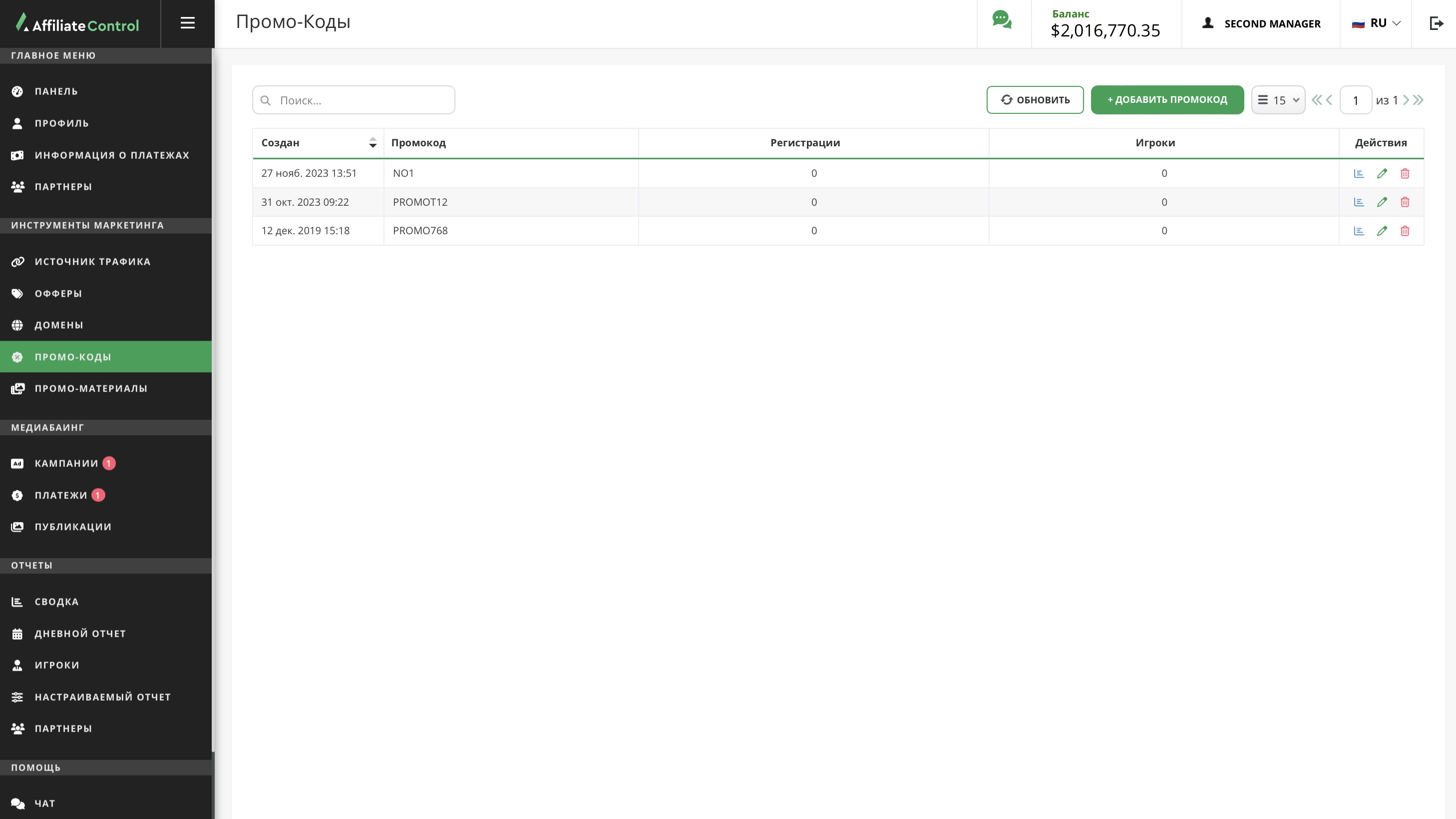 - Нажмите кнопку "Добавить промокод".