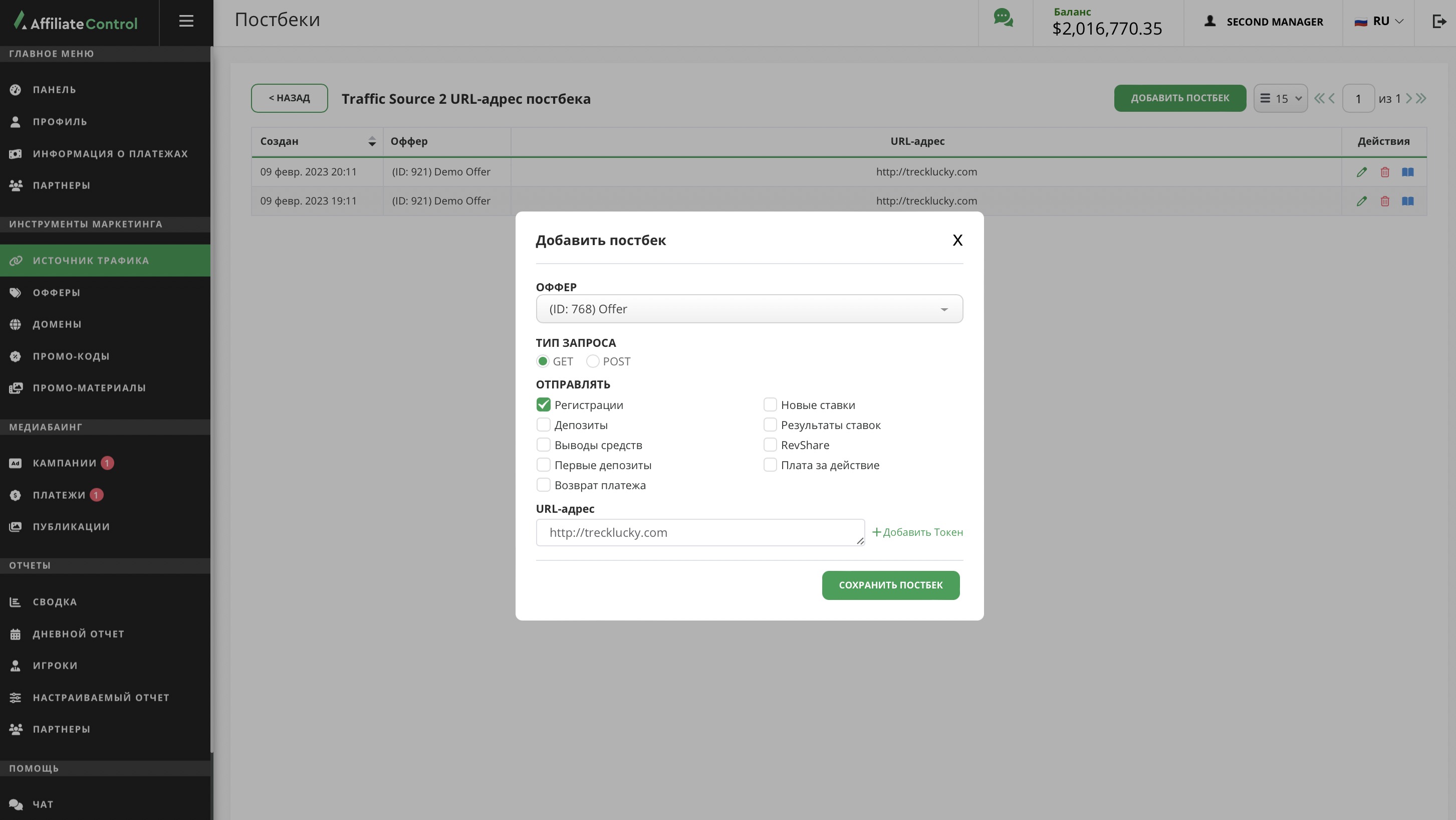 - На открывшейся странице выбрать "Добавить постбек". Откроется окно добавления постбека: