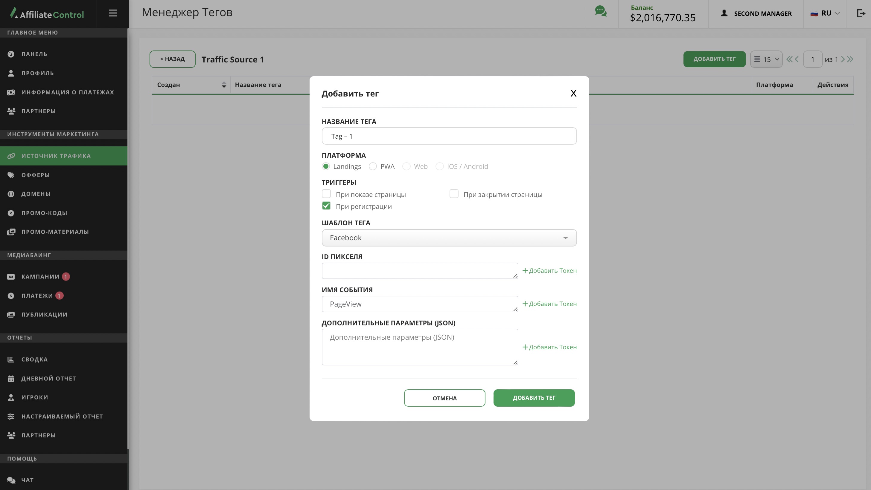 Тег - предопределенный фрагмент кода JavaScript, который размещается на странице сайта и помогает более эффективно таргетировать рекламу. Используйте тег, если ваш источник трафика не поддерживает получение информации о совершенных действиях игрока с помощью постбеков.