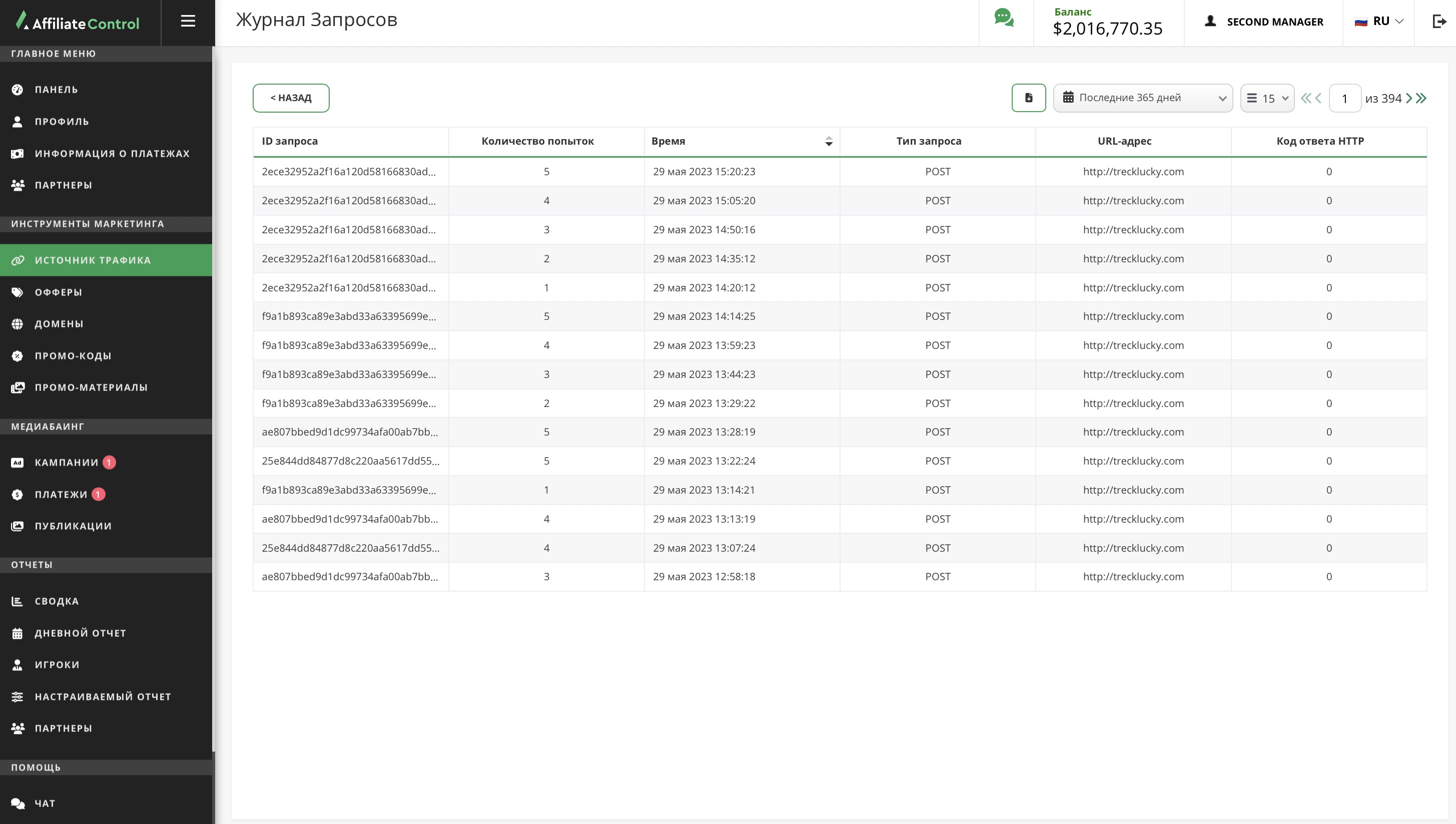 Для отладки и проверки ваших постбеков вы можете посмотреть журнал запросов каждого из настроенных постбеков. Журнал запросов содержит: