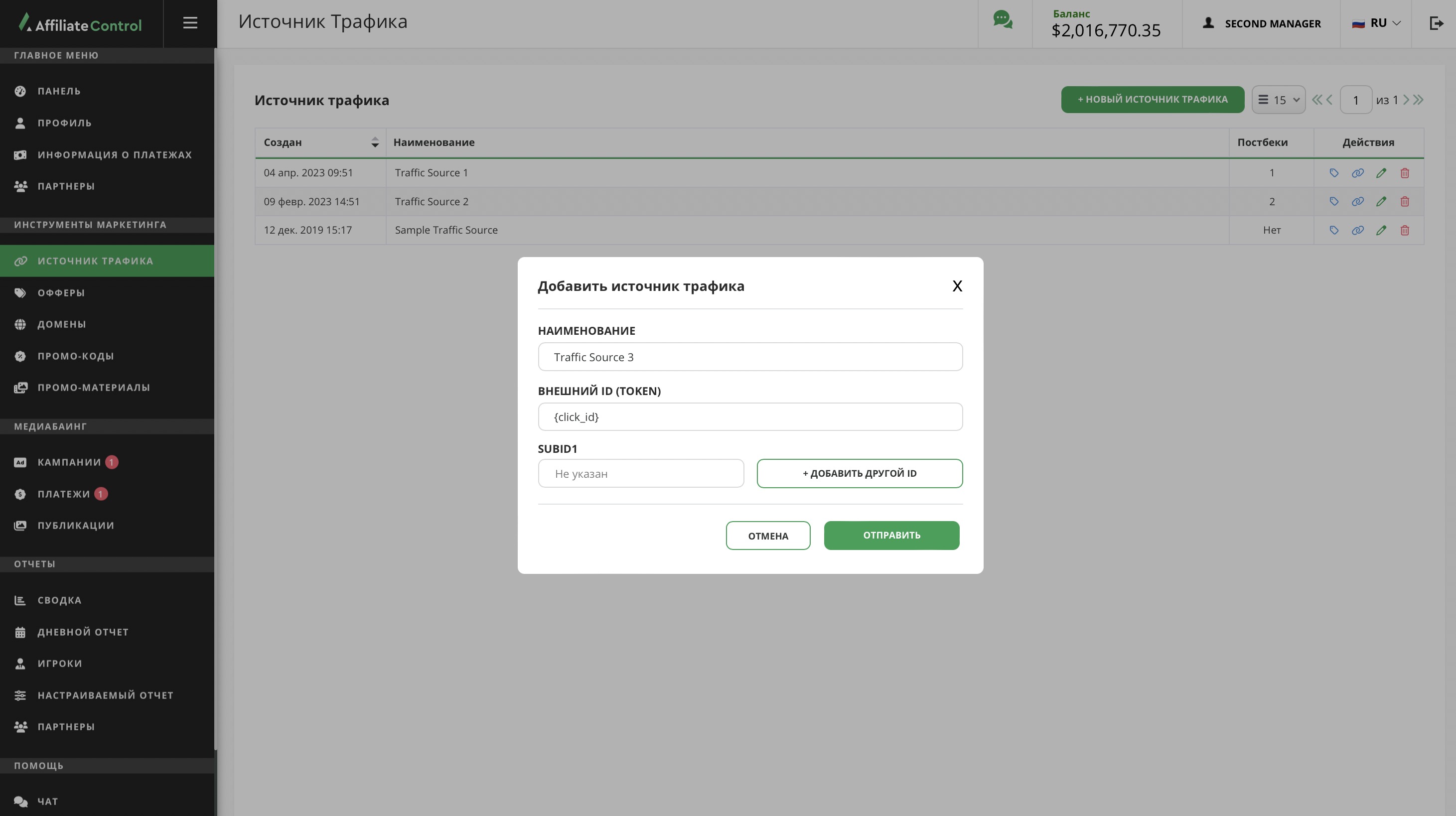 При использовании нескольких каналов привлечения вы можете создать несколько источников трафика в вашей панели. С их помощью вы сможете разделить статистику по каждому источнику в отчетах. Также настройка источников трафика обязательна при необходимости настройки постбеков.
