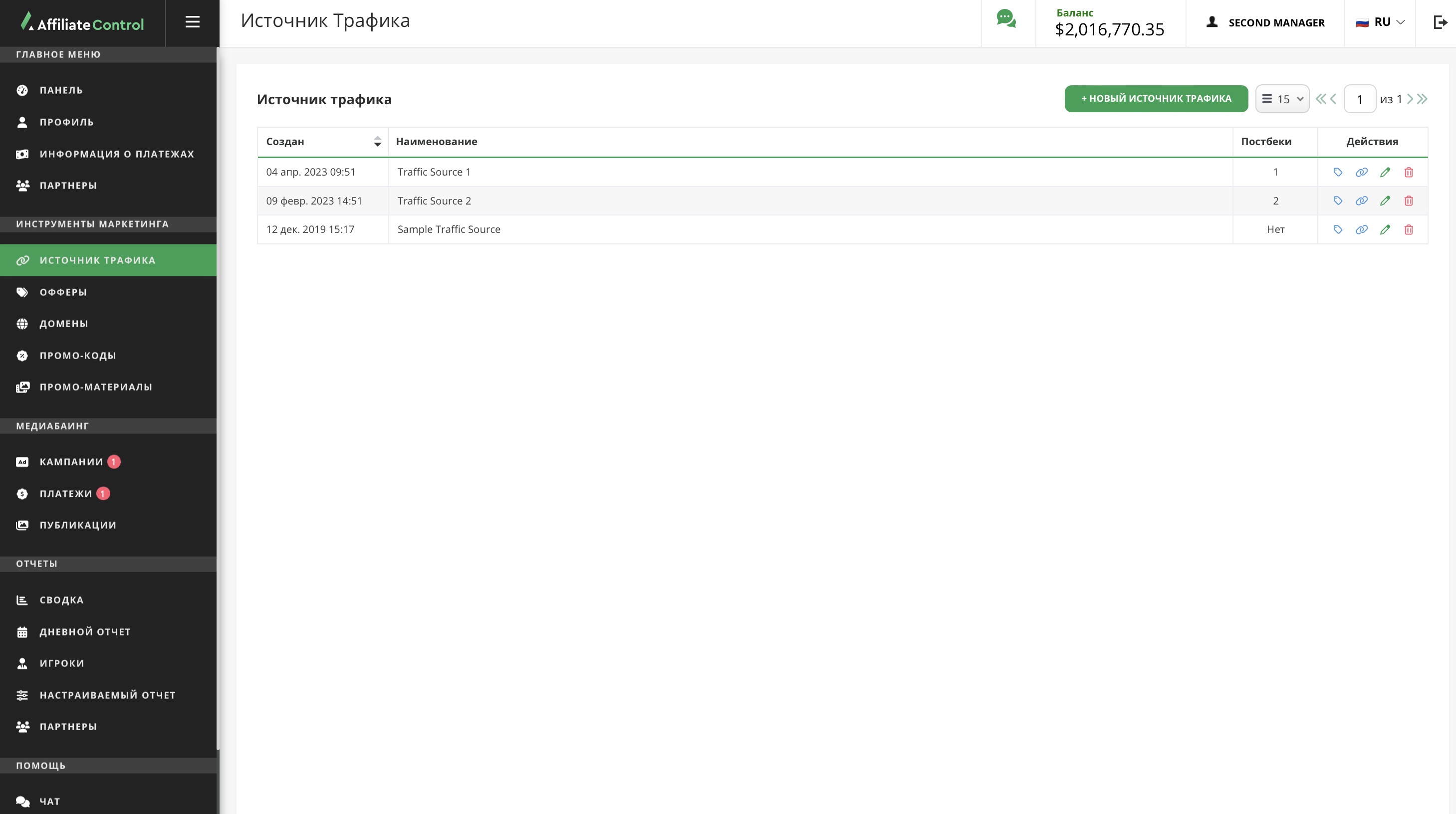 - Создать новый или найти в списке нужный источник трафика, в колонке "Действия" выбрать "Постбеки".