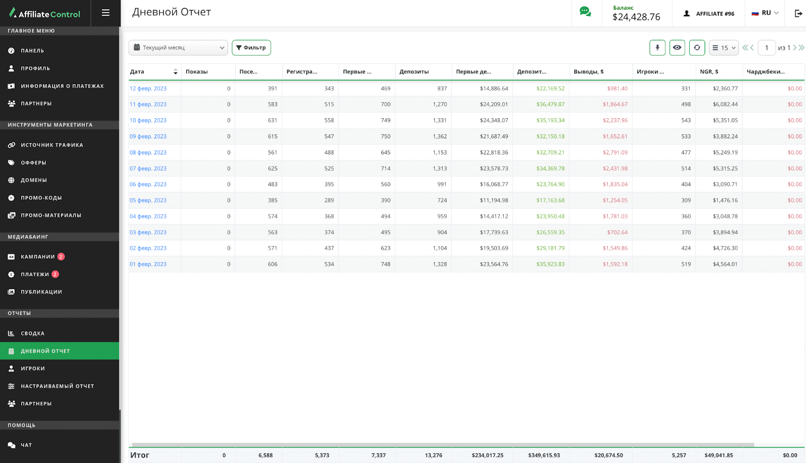 Ежедневный отчет показывает отчет по основным показателям с разбивкой по дням.
