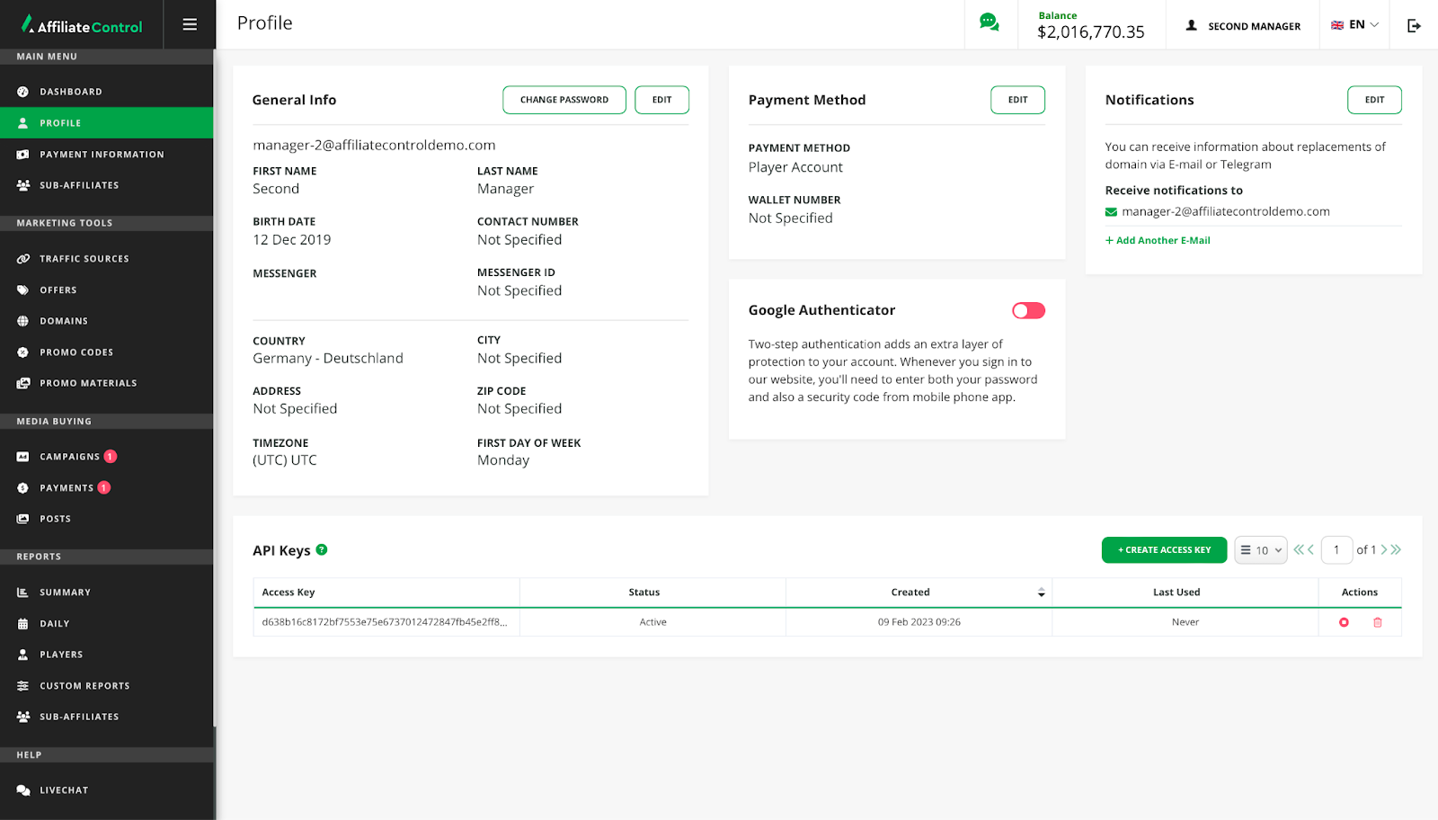 You can manage your account settings or create reports using our API. The API specification is described at https://affiliatecontrol-api.com/affiliates/docs/