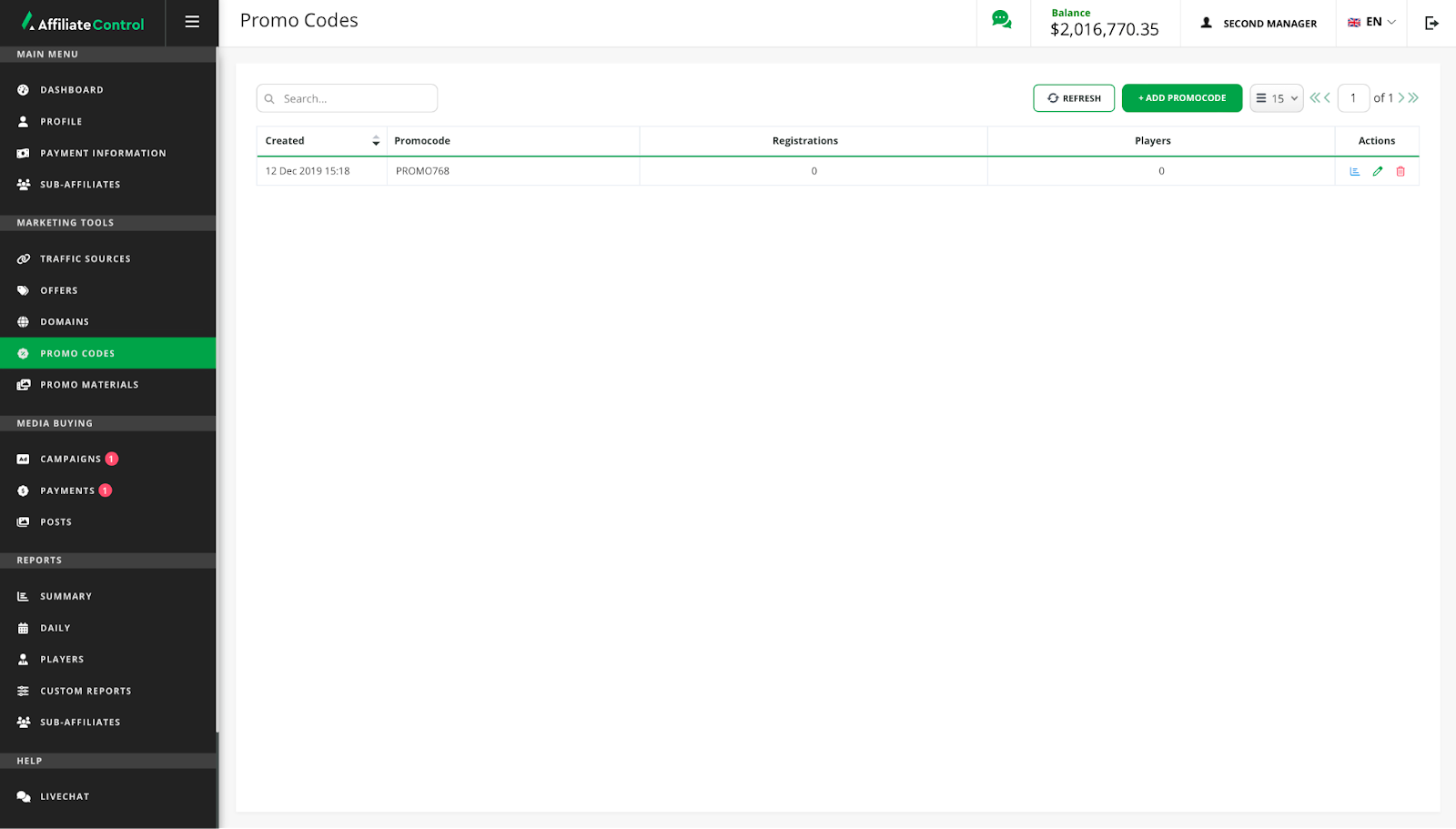 Using certain channels of attraction, placing tracking URLs may not be possible. In such cases you can generate and provide players with a promo code. Using this promo code during registration, players will be linked to the affiliate's account. Each offer may have one or more promo codes pinned to it.