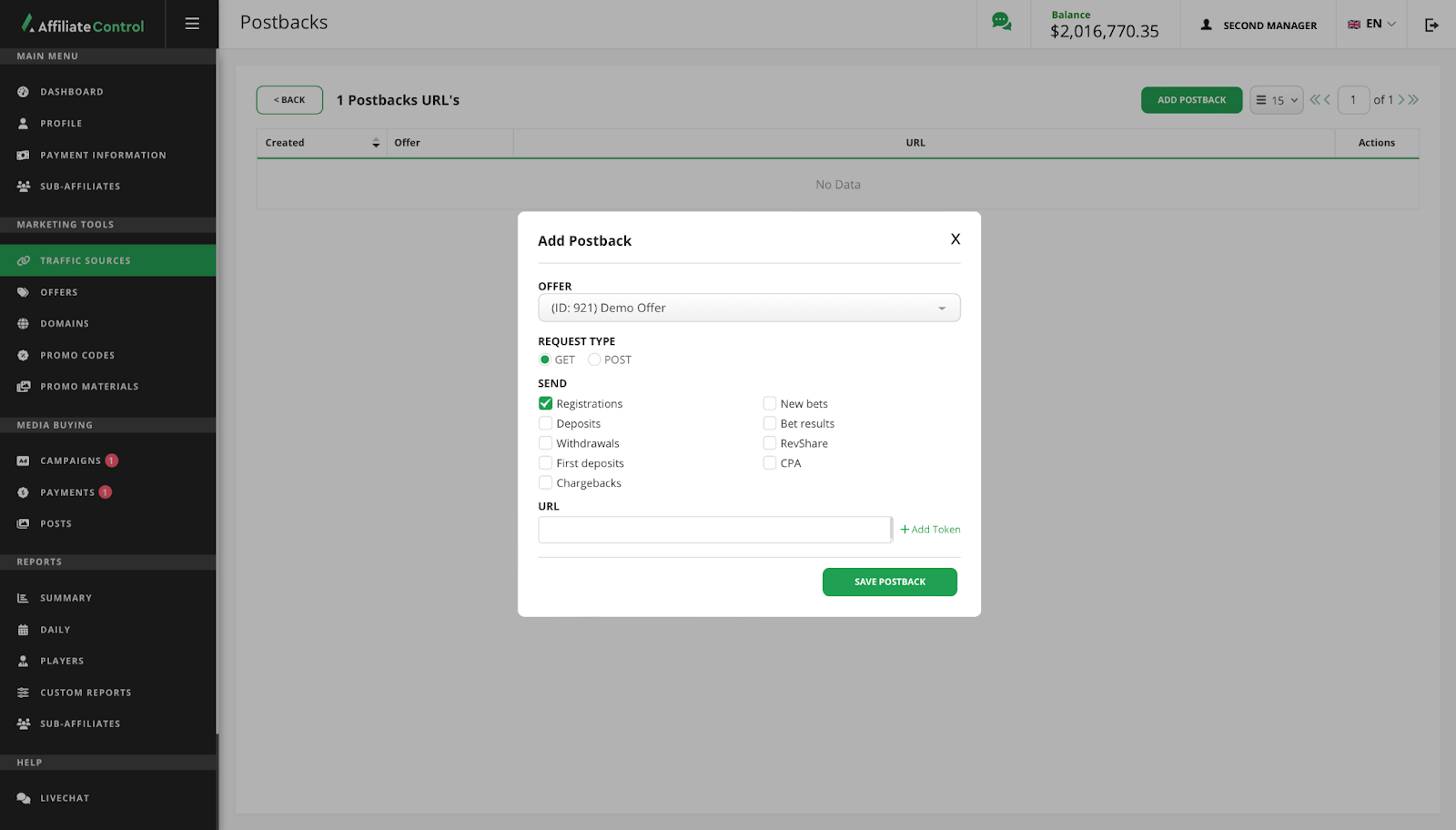 The affiliate program has the ability to use postbacks to inform traffic sources about certain player events.