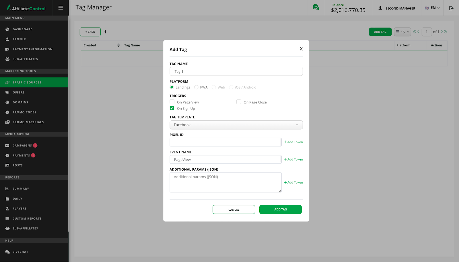 Tag - a predefined fragment of JavaScript code which is placed on a website page and helps to target ads more effectively. Use tag in case your traffic source does not support receiving information about performed player’s actions with the help of postbacks.