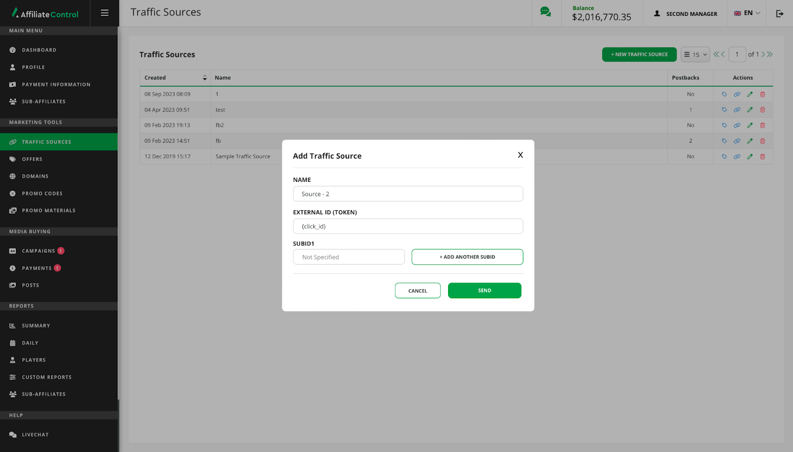 Using multiple attraction channels, you can create several traffic sources in your dashboard. With their help, you will be able to separate statistics for each source in reports. Setting up traffic sources is also mandatory if you need to set up postbacks.