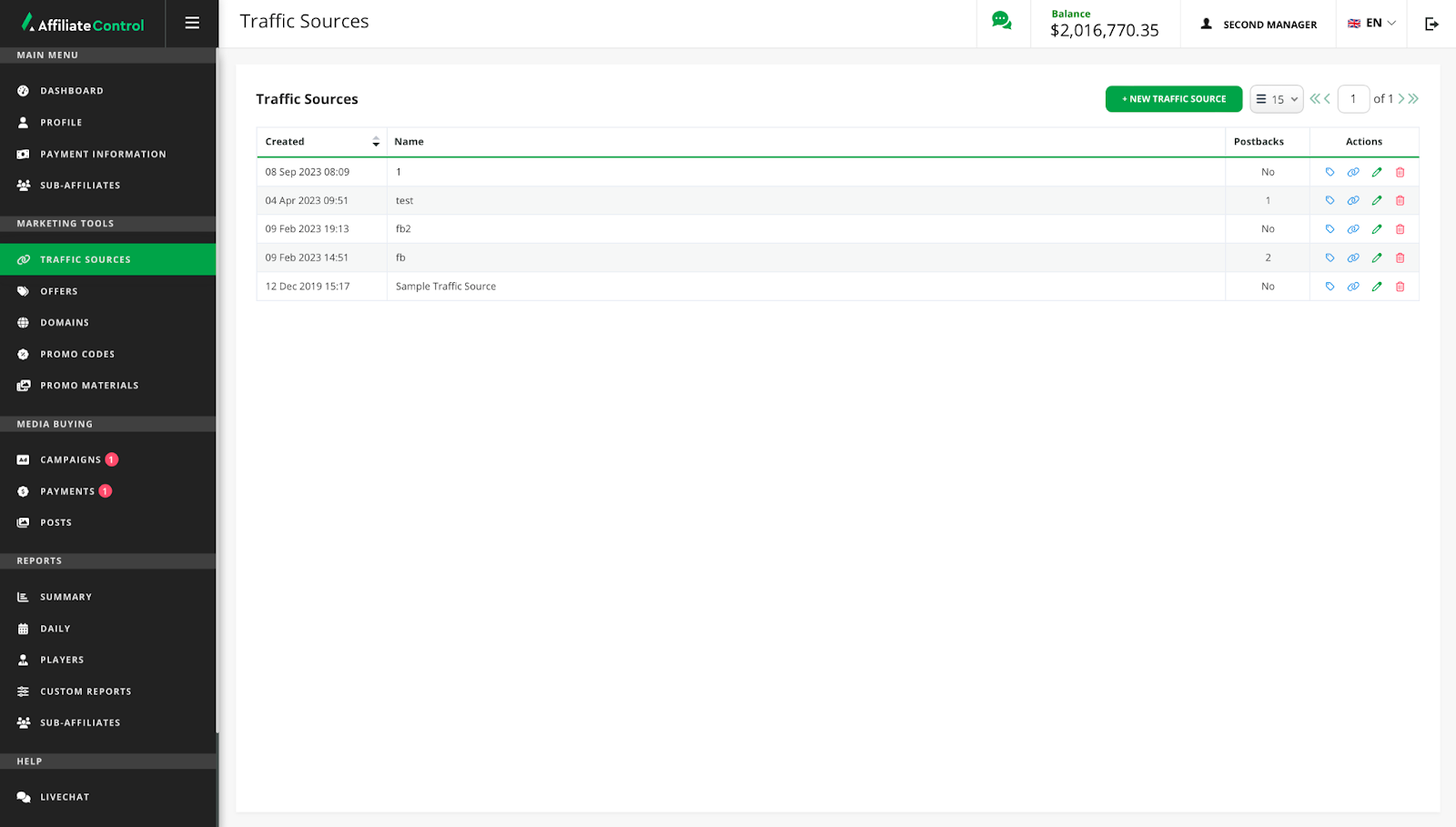 - Create a new one or find the required traffic source in the list, select "Postbacks" in the "Actions" column.