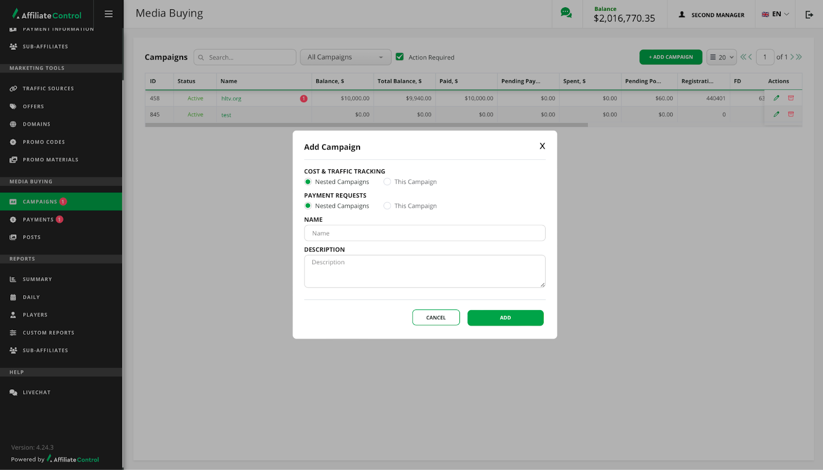In order to add an advertising campaign, the affiliate need to click on the "Add campaign" button above the table, then fill in all the fields in the pop-up that opens, following the following instructions:
