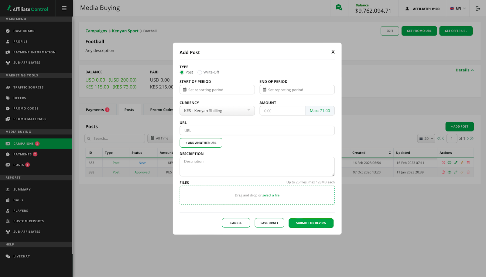 Select the type of post (post / write-off) → specify the period for which the report is generated (the end of the period should not be more than the current day) → specify the currency → enter the amount spent → enter the URL (optional field) → fill in the "description" field → attach files (optional field) → click "Submit for review" or "Save draft" (in this case, the post is not sent for review and it can be reworked).