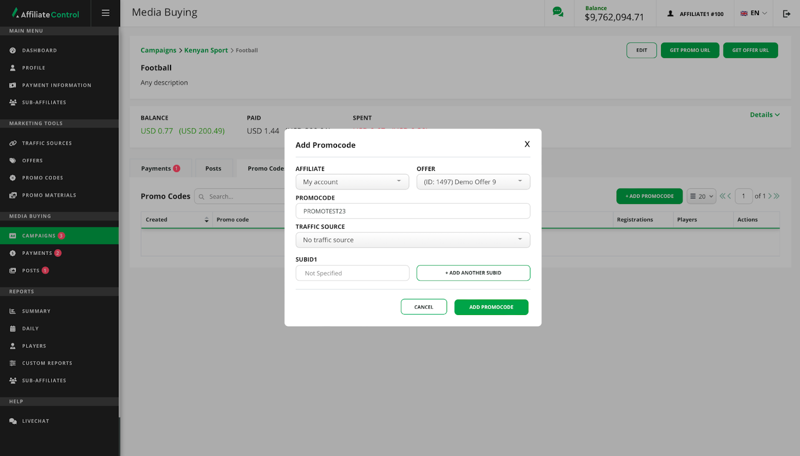 Click "Add promocode" → select an affiliate → in the "PromoCode" field, enter the name of the promo code → select the offer to which you want to attach the promo code → select the traffic source, if necessary → add a sub id, if necessary → click "Add promocode".