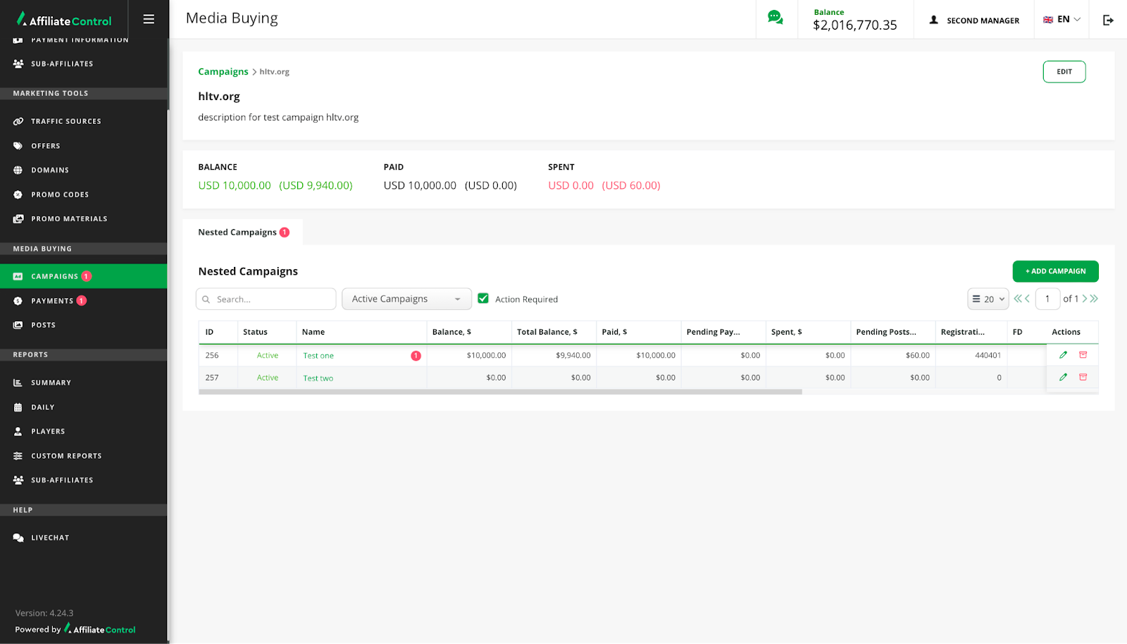• This campaign – nested campaigns. An unlimited number of nested campaigns are created inside the created parent campaign. All functions are available for the parent campaign (getting the promo URL and the offer URL, creating posts, adding promo codes, viewing the summary report), except for the payment request. The payment request is made from each nested campaign separately.