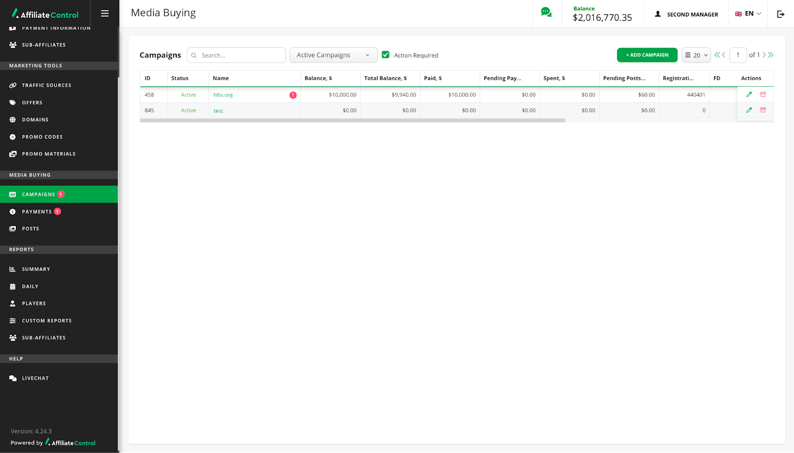 • The "Add Campaign" button. A detailed description of the process of creating a new campaign is described at the link.