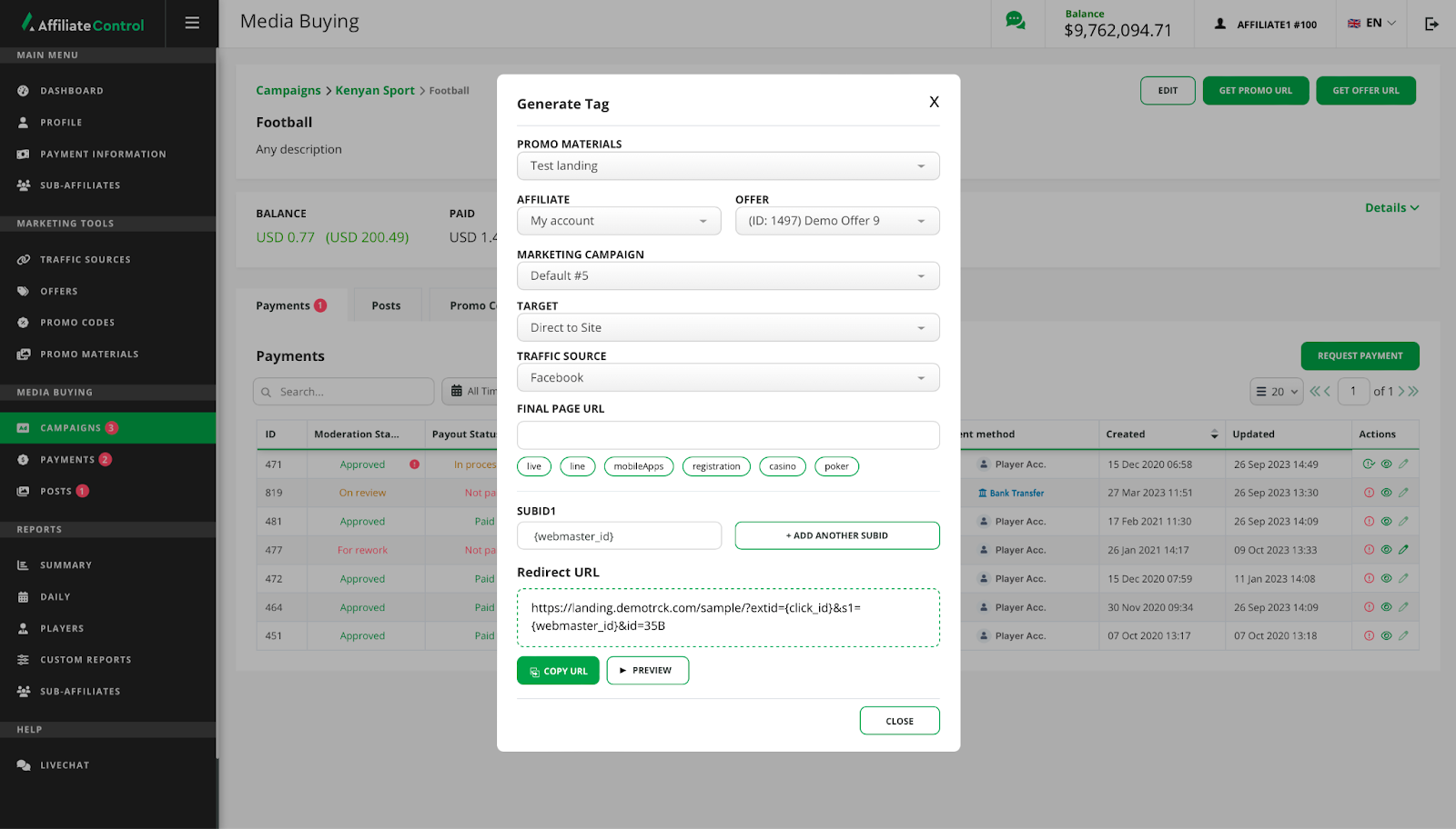 Click the "Get promo url" button → select a brand (the field is available if more than one brand is assigned to the affiliate) → select the type of promotional material: landing / banner (for the "Banner" type, the link will be replaced with a code) → select for whom the link / code is generated → select an offer → select a marketing campaign (the list is available if more than one rotation group is assigned to the affiliate) → select the target → for the "Banner" type, select the image size → select the language (language selection is available if several languages are specified on the promo material) → select the traffic source → manually enter the final url without a domain or select from the suggested (action optional) → add a sub id, to do this, click "Add another ID" (optional action) → click "Copy URL" / "Copy code".