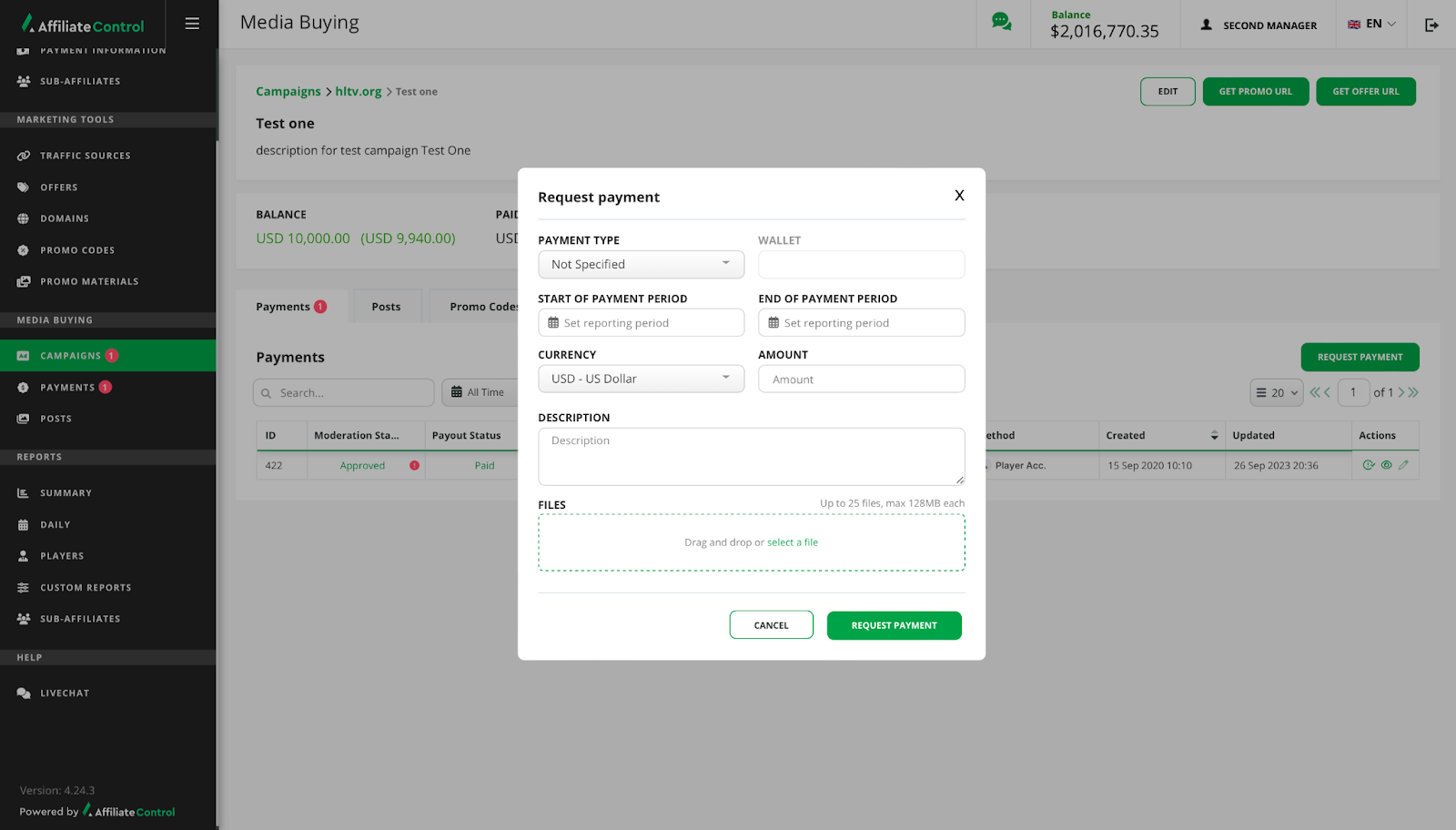 • This campaign – this campaign. One main campaign is being created (it is not possible to create nested campaigns), in which the following are available: a payment request, creating posts, adding promo codes, forming a summary report, getting the promo URL and the offer URL.