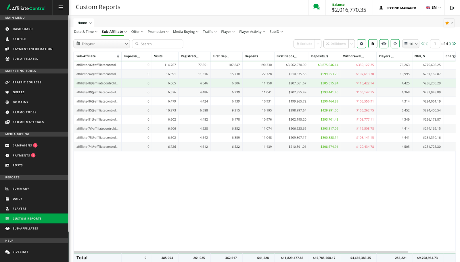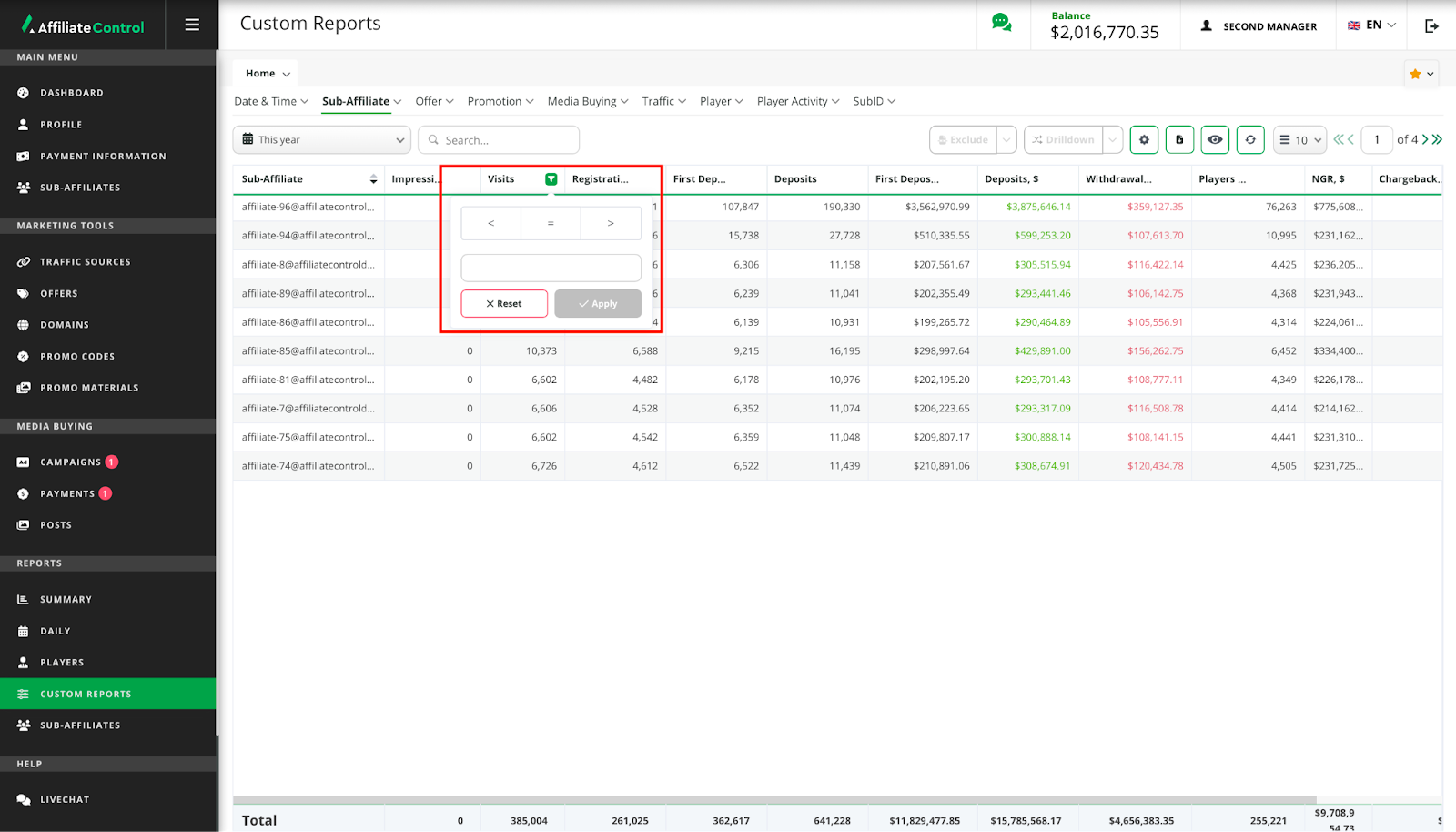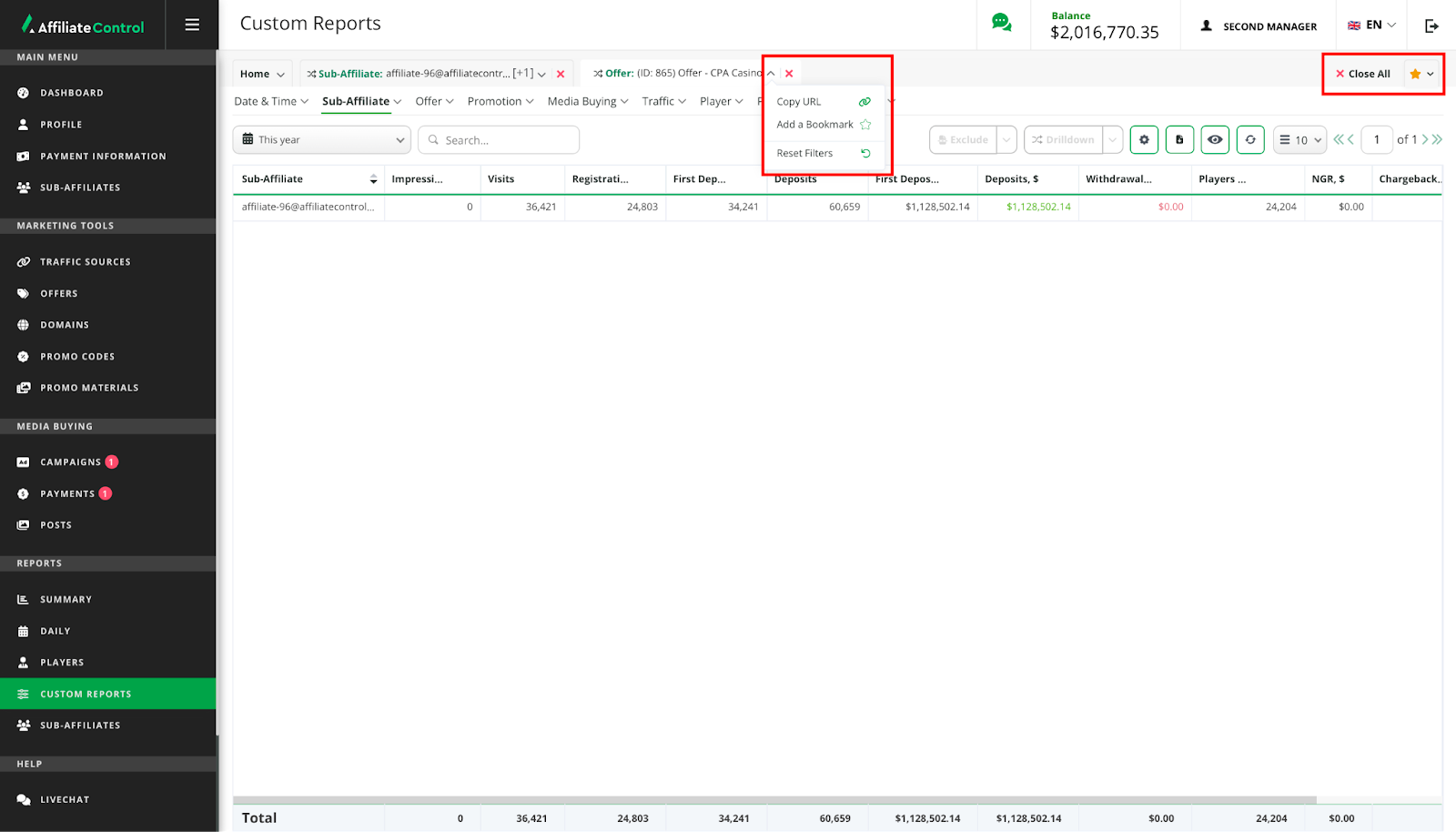 The custom report allows an affiliate to create flexible reports and filtering of results.