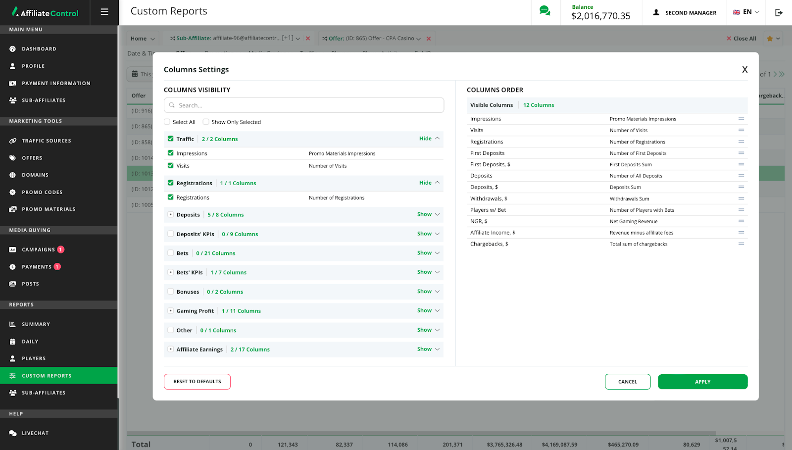 - Columns settings. Allows an affiliate to add the necessary metric to the table if it is not included in the default list. Click on the eye to select a metric.